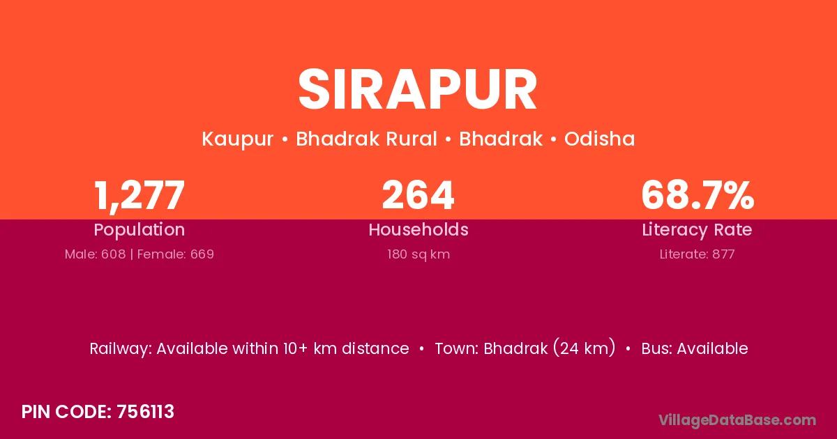 Soro (3 km) is the nearest town to Sirapur village for major economic activities and is located approximately 3 km away.