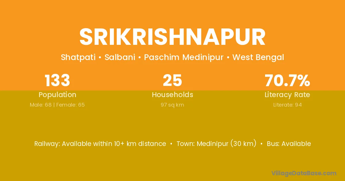 The literacy rate of Srikrishnapur village is 79.07%. Male literacy stands at 78.26% and female literacy at 80.00%.