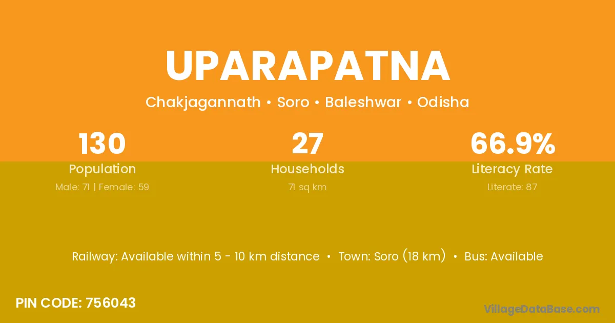 Soro (18 km) is the nearest town to Uparapatna village for major economic activities and is located approximately 18 km away.