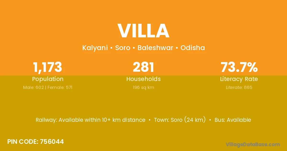 The literacy rate of Villa village is 73.74%. Male literacy stands at 79.07% and female literacy at 68.13%.