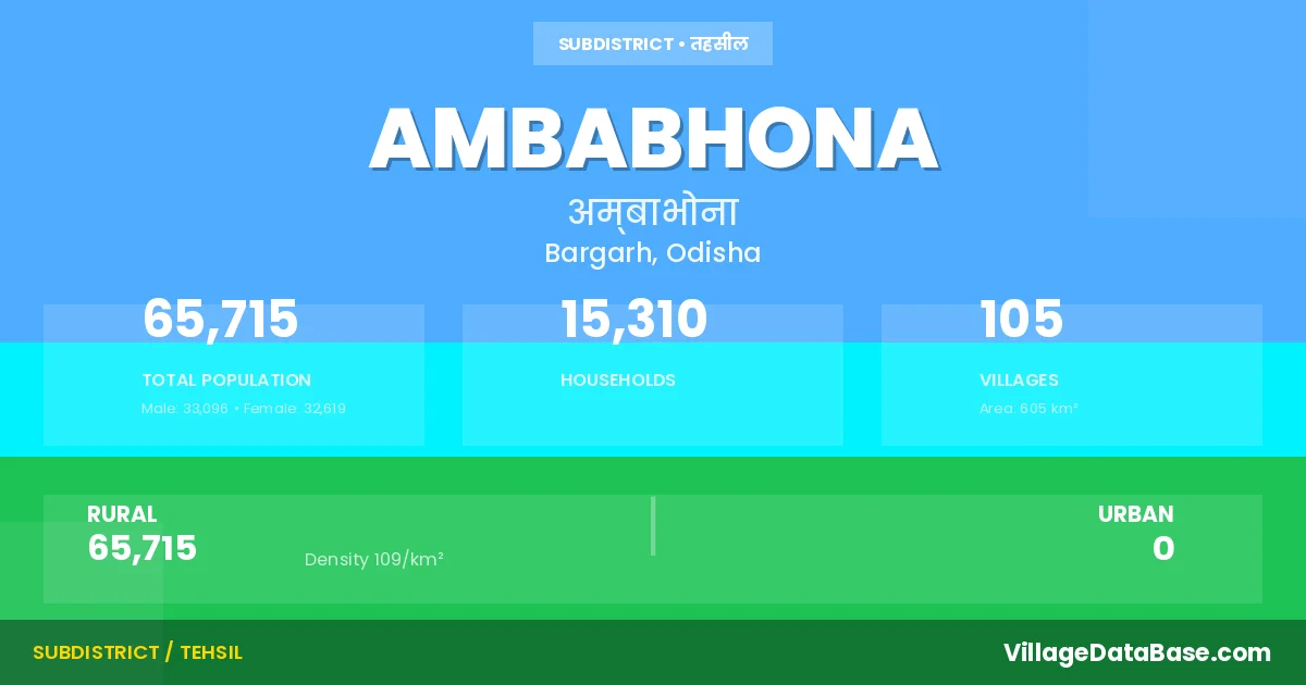 According to the 2011 census The total area of Ambabhona Tehsil is 605 km², with a population of 65715 people. The population density is 109 inhabitants per square kilometre, and there are approximately 15310 houses in the sub district.