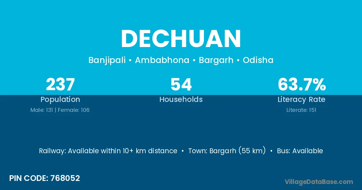 Bargarh (55 km) is the nearest town to Dechuan village for major economic activities and is located approximately 55 km away.