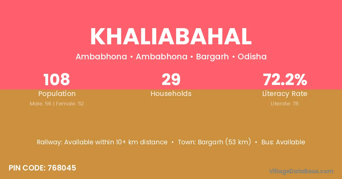 Khaliabahal village has a total population of 108 people, of which 56 are males and 52 are females.