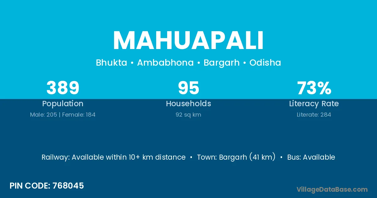 Mahuapali village has a total population of 389 people, of which 205 are males and 184 are females.