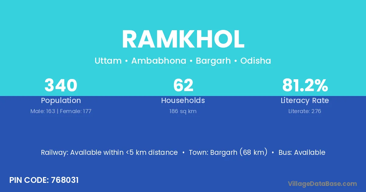 Bargarh (68 km) is the nearest town to Ramkhol village for major economic activities and is located approximately 68 km away.