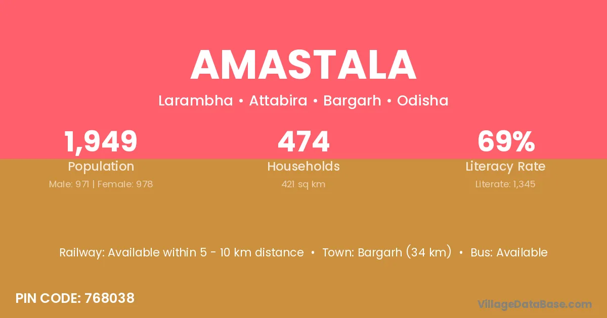 Bargarh (34 km) is the nearest town to Amastala village for major economic activities and is located approximately 34 km away.