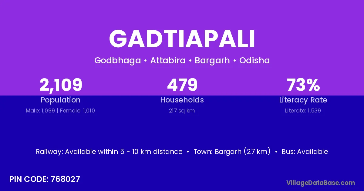 Bargarh (27 km) is the nearest town to Gadtiapali village for major economic activities and is located approximately 27 km away.