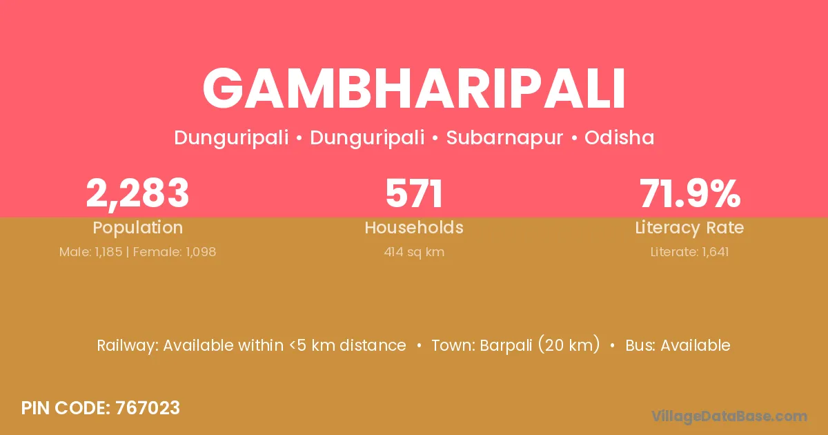 Bargarh (35 km) is the nearest town to Gambharipali village for major economic activities and is located approximately 35 km away.