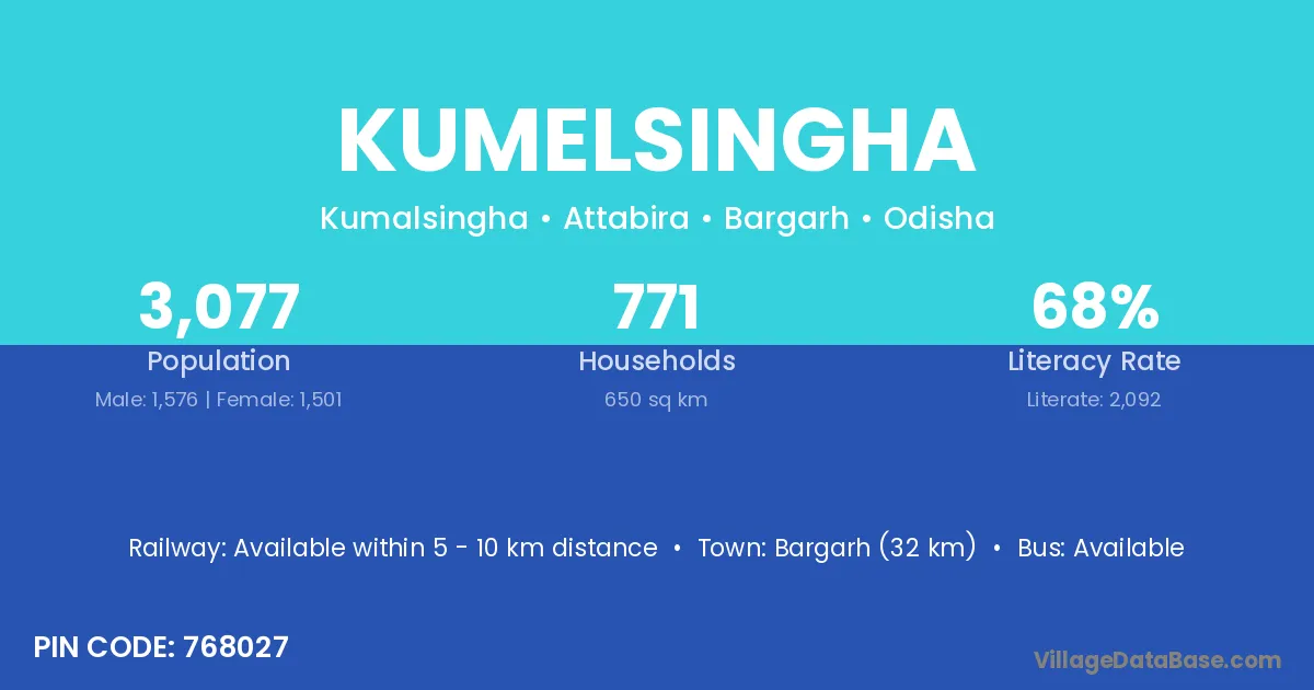 Bargarh (32 km) is the nearest town to Kumelsingha village for major economic activities and is located approximately 32 km away.