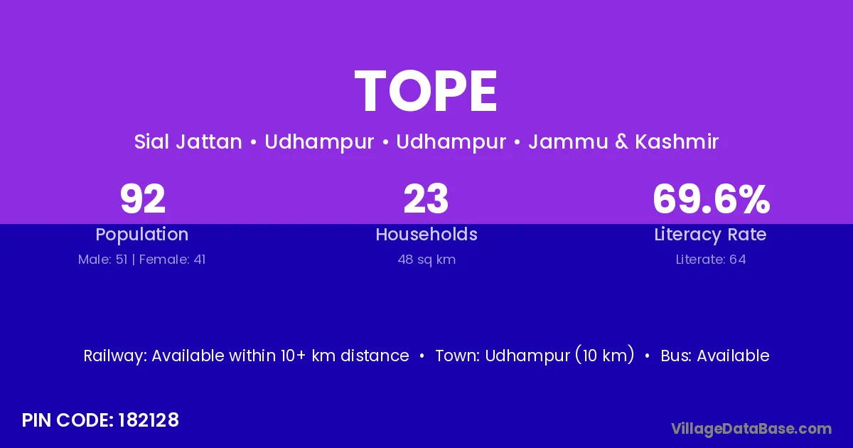The literacy rate of Tope village is 67.81%. Male literacy stands at 75.05% and female literacy at 60.25%.