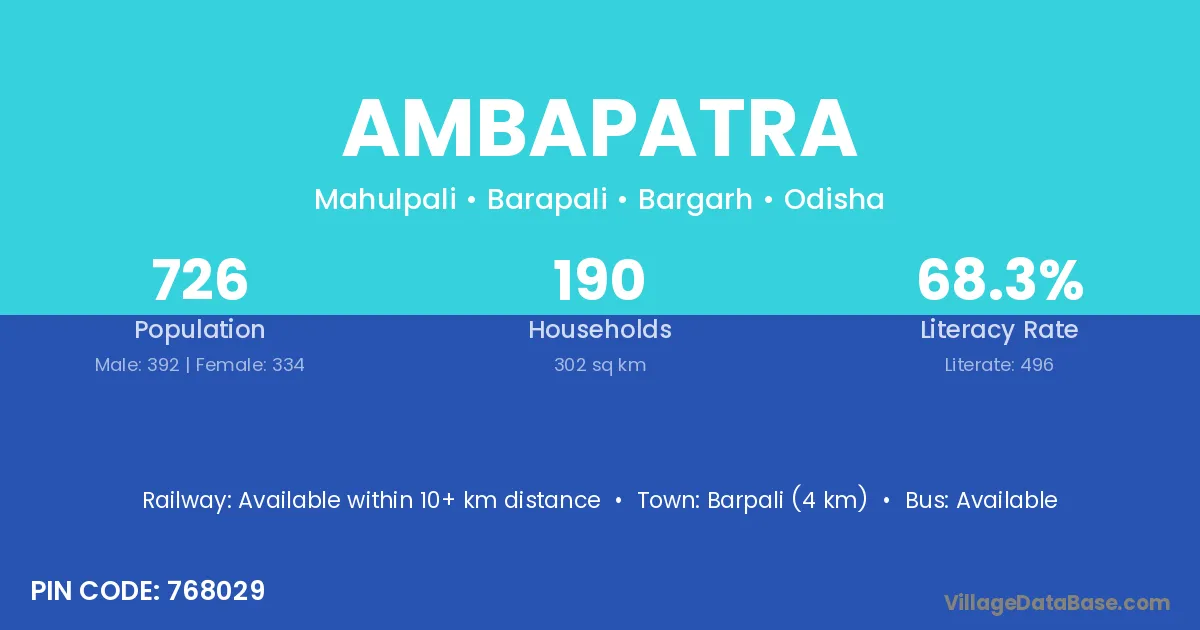 Ambapatra village has a total population of 726 people, of which 392 are males and 334 are females.