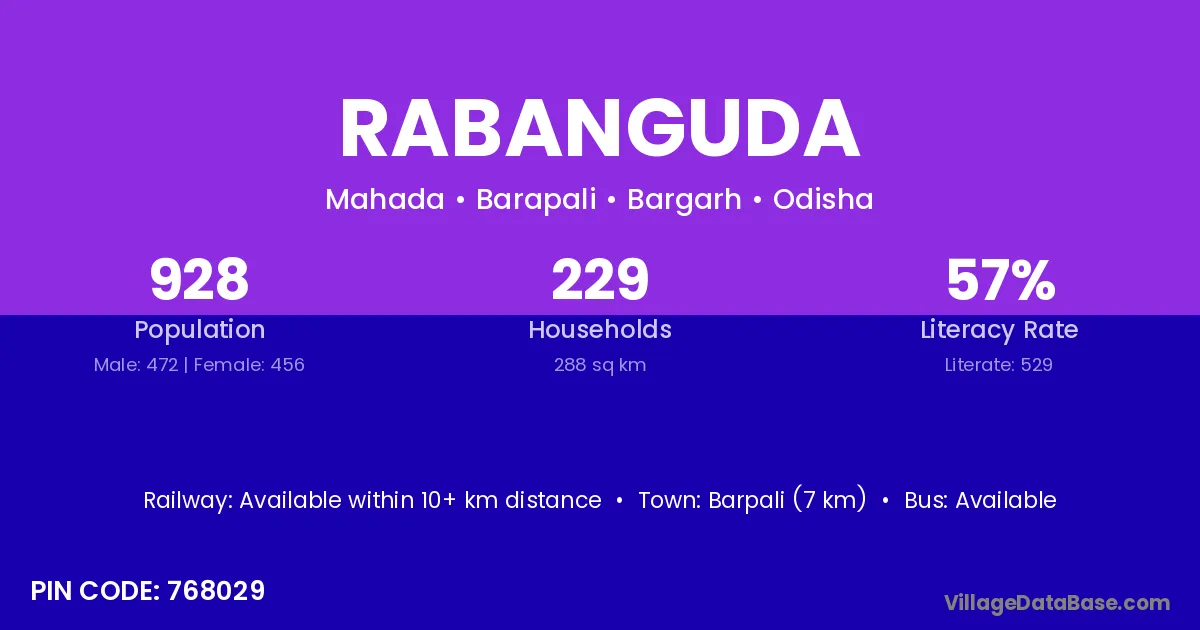 According to Census 2011 information, the village code of Rabanguda village is 768029.