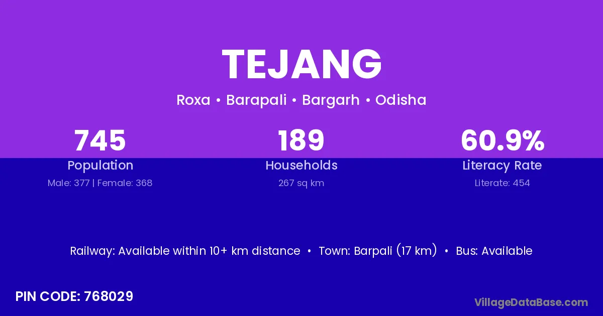 Tejang village has a total population of 745 people, of which 377 are males and 368 are females.