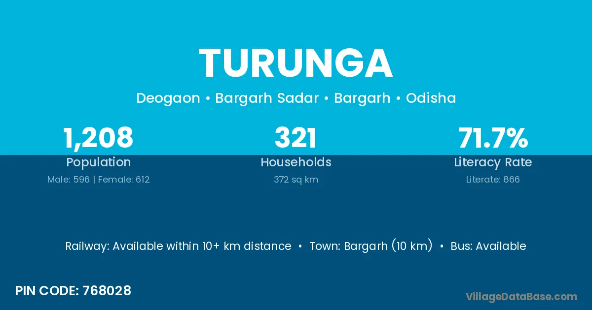 Bargarh (10 km) is the nearest town to Turunga village for major economic activities and is located approximately 10 km away.