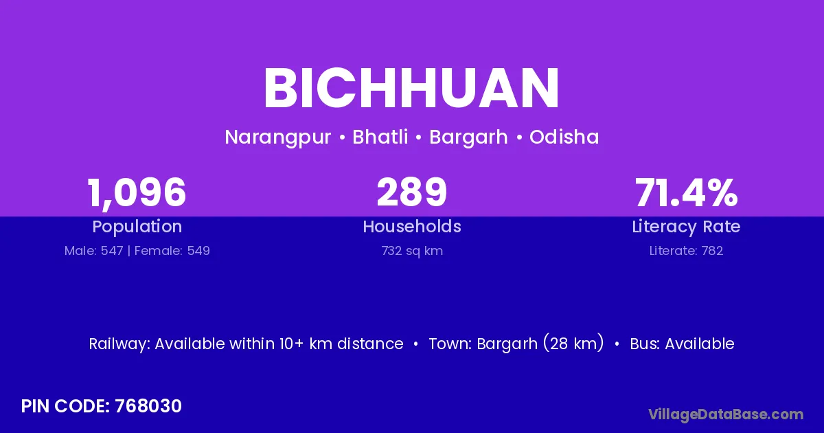 Bargarh (28 km) is the nearest town to Bichhuan village for major economic activities and is located approximately 28 km away.