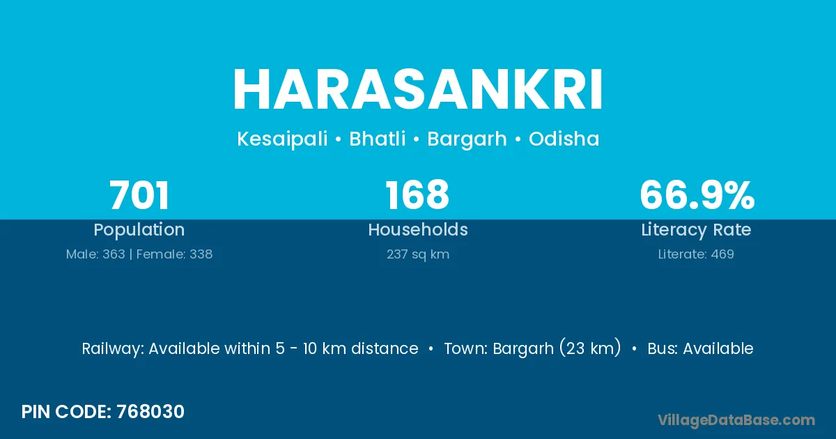 Bargarh (23 km) is the nearest town to Harasankri village for major economic activities and is located approximately 23 km away.