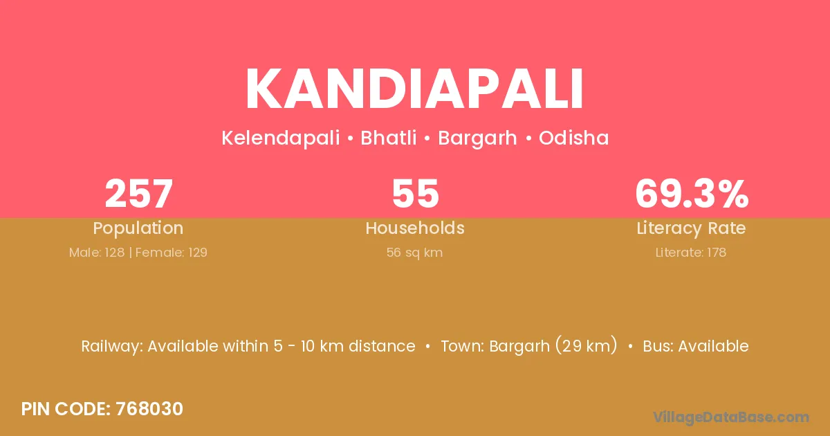 Kandiapali village has a total population of 257 people, of which 128 are males and 129 are females.
