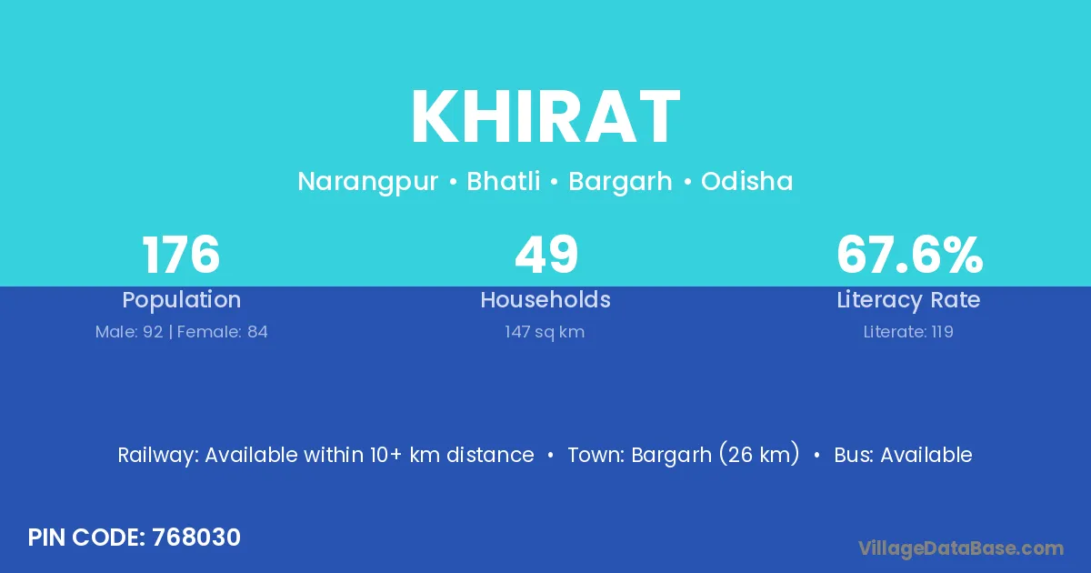 Bargarh (26 km) is the nearest town to Khirat village for major economic activities and is located approximately 26 km away.