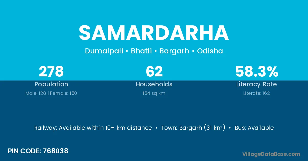 Bargarh (31 km) is the nearest town to Samardarha village for major economic activities and is located approximately 31 km away.