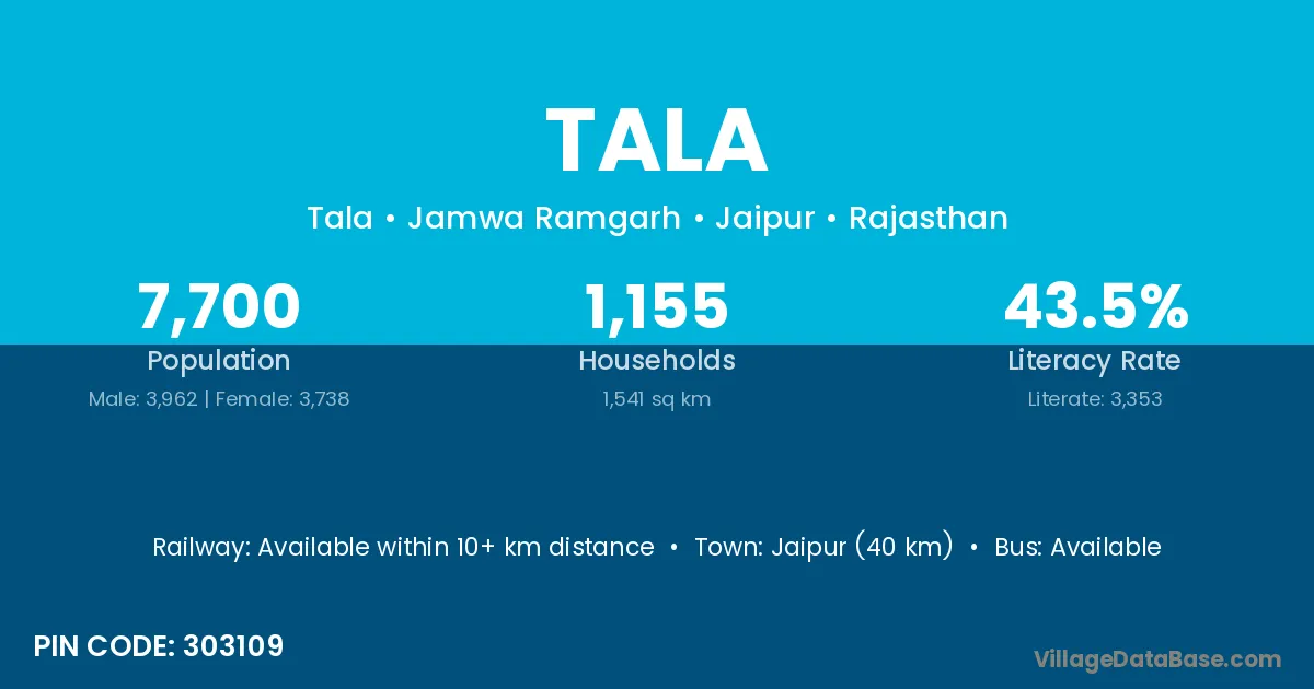 The literacy rate of Tala village is 73.61%. Male literacy stands at 79.19% and female literacy at 67.86%.