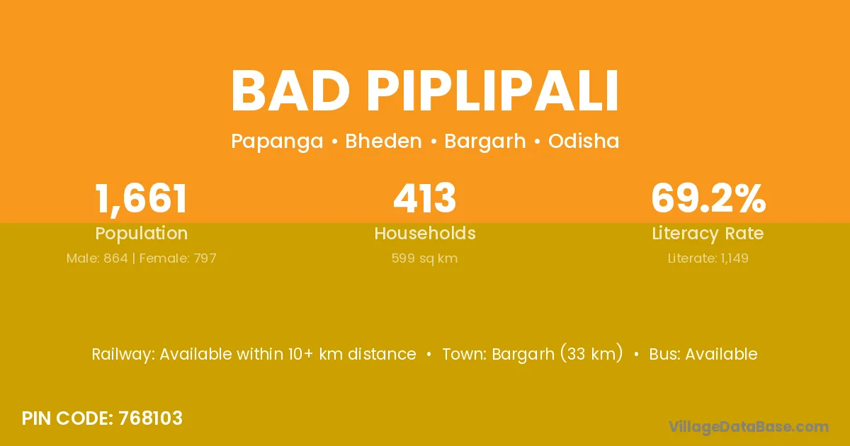 Bargarh (33 km) is the nearest town to Bad Piplipali village for major economic activities and is located approximately 33 km away.
