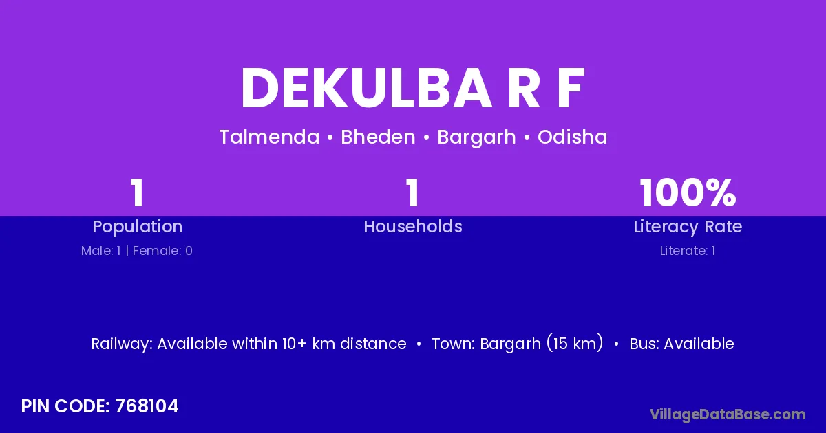 Bargarh (15 km) is the nearest town to Dekulba R F village for major economic activities and is located approximately 15 km away.
