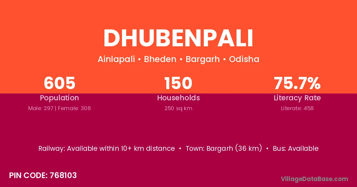 Dhubenpali village has a total population of 605 people, of which 297 are males and 308 are females.