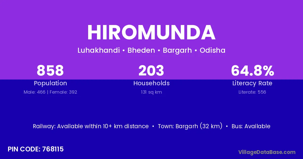Bargarh (32 km) is the nearest town to Hiromunda village for major economic activities and is located approximately 32 km away.