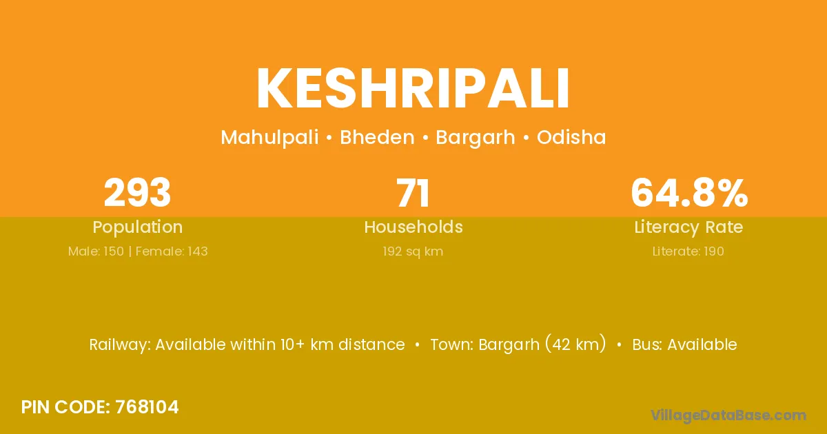Bargarh (42 km) is the nearest town to Keshripali village for major economic activities and is located approximately 42 km away.