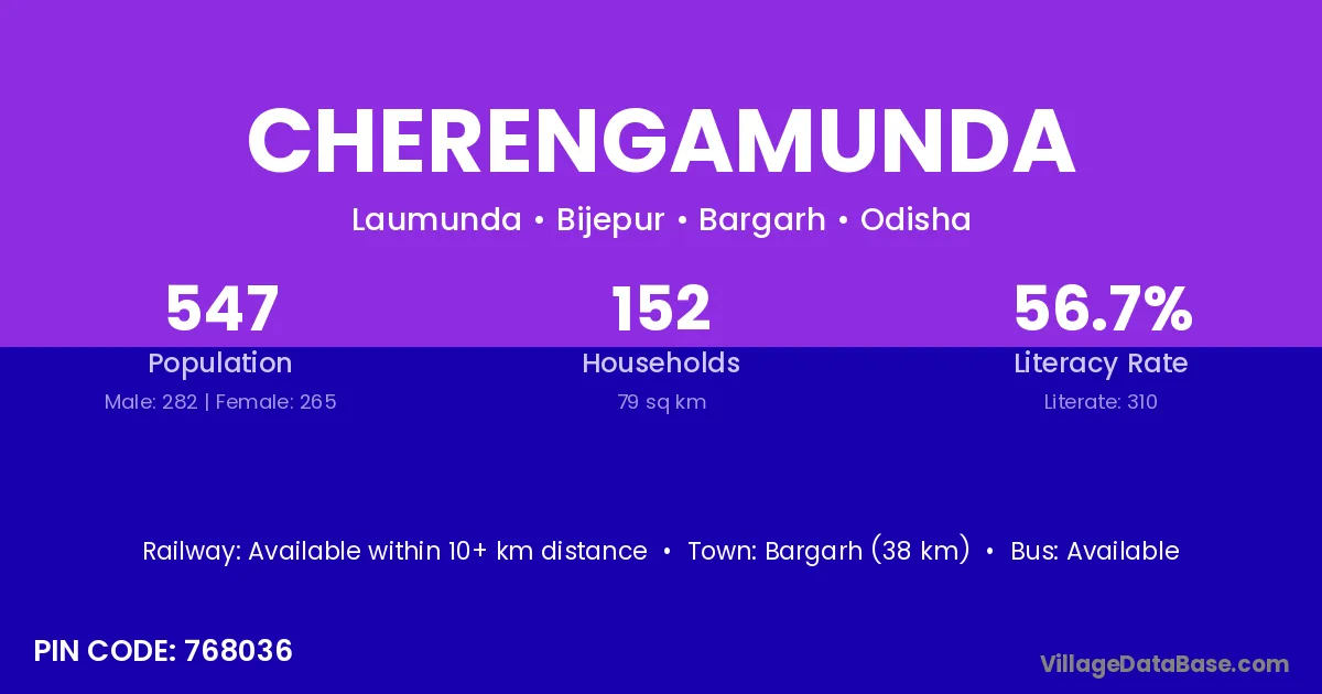 Bargarh (38 km) is the nearest town to Cherengamunda village for major economic activities and is located approximately 38 km away.