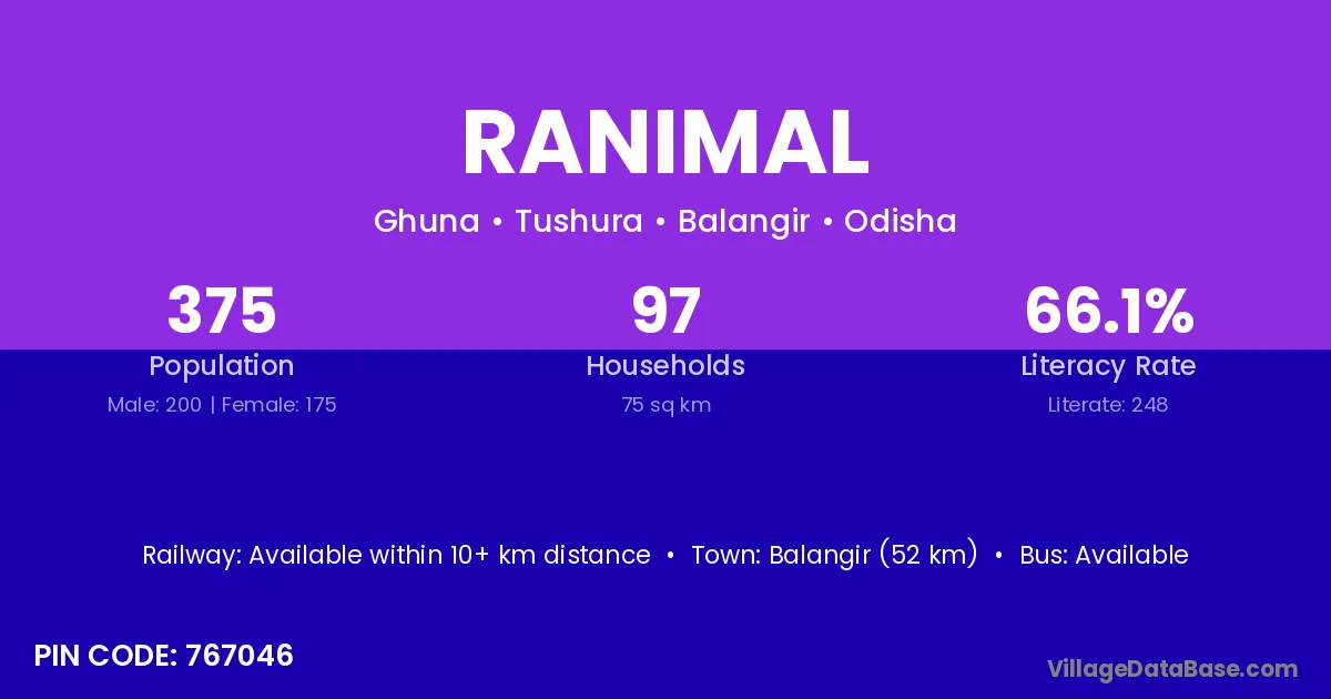 Bargarh (43 km) is the nearest town to Ranimal village for major economic activities and is located approximately 43 km away.