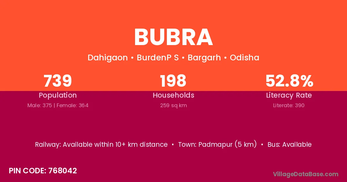 According to Census 2011 information, the village code of Bubra village is 768042.