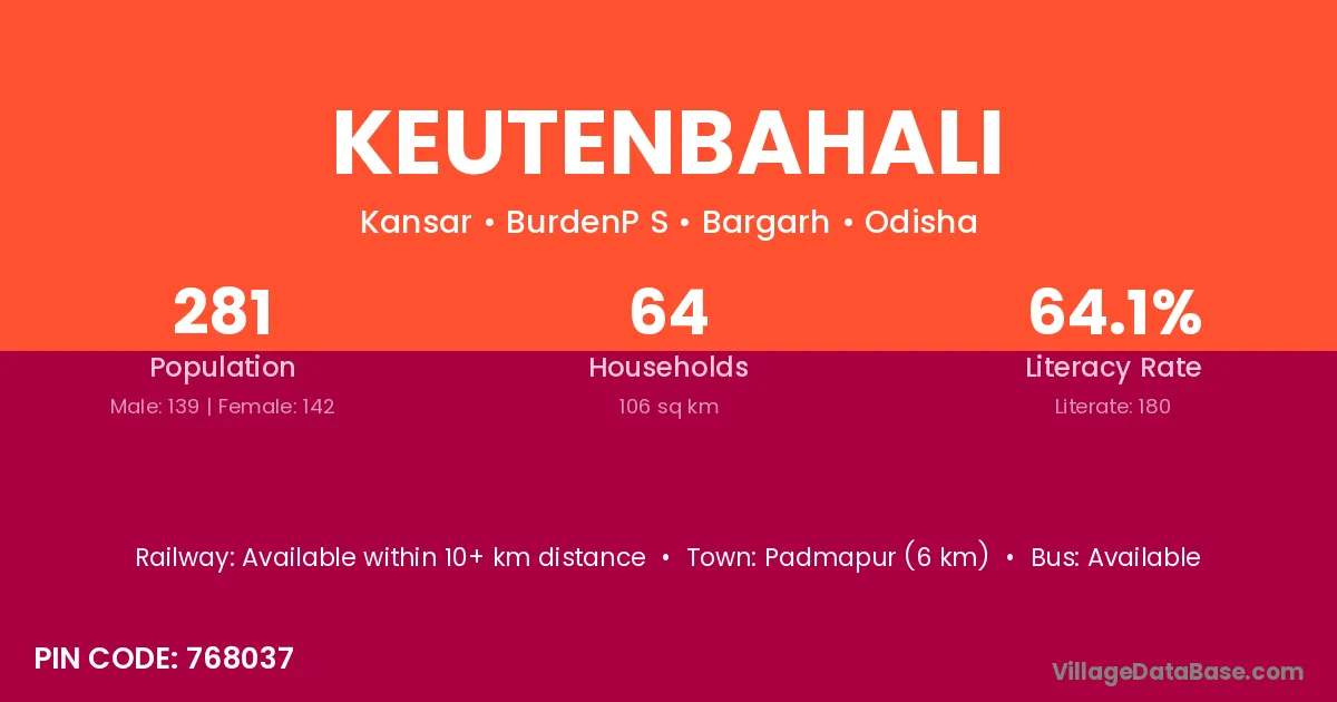 Padmapur (6 km) is the nearest town to Keutenbahali village for major economic activities and is located approximately 6 km away.