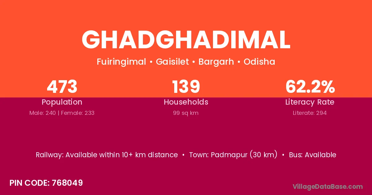 Padmapur (30 km) is the nearest town to Ghadghadimal village for major economic activities and is located approximately 30 km away.
