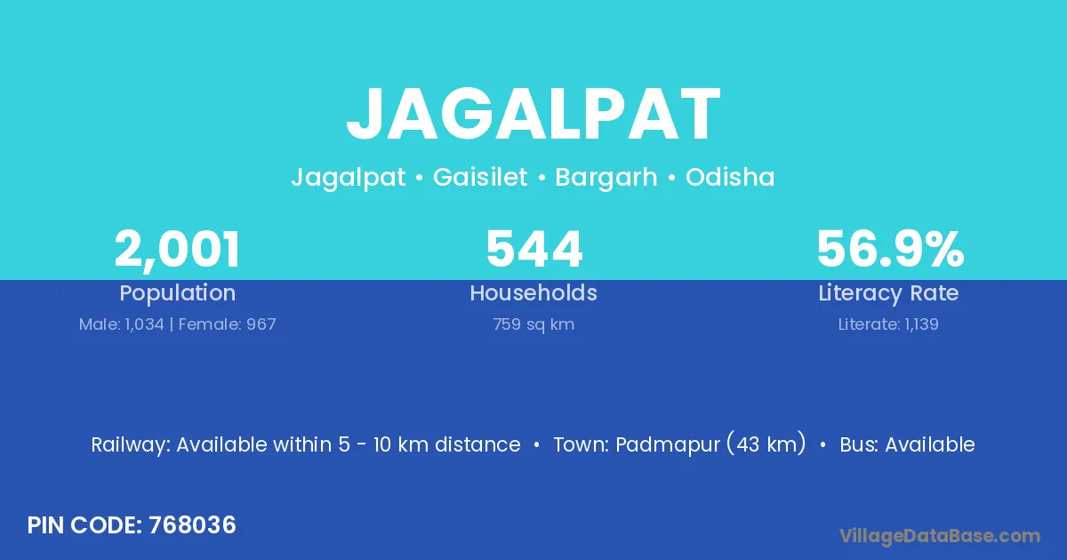 Padmapur (43 km) is the nearest town to Jagalpat village for major economic activities and is located approximately 43 km away.