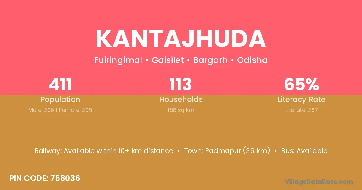 Padmapur (35 km) is the nearest town to Kantajhuda village for major economic activities and is located approximately 35 km away.