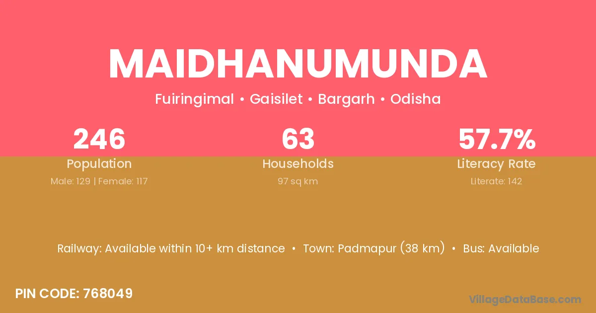 Padmapur (38 km) is the nearest town to Maidhanumunda village for major economic activities and is located approximately 38 km away.
