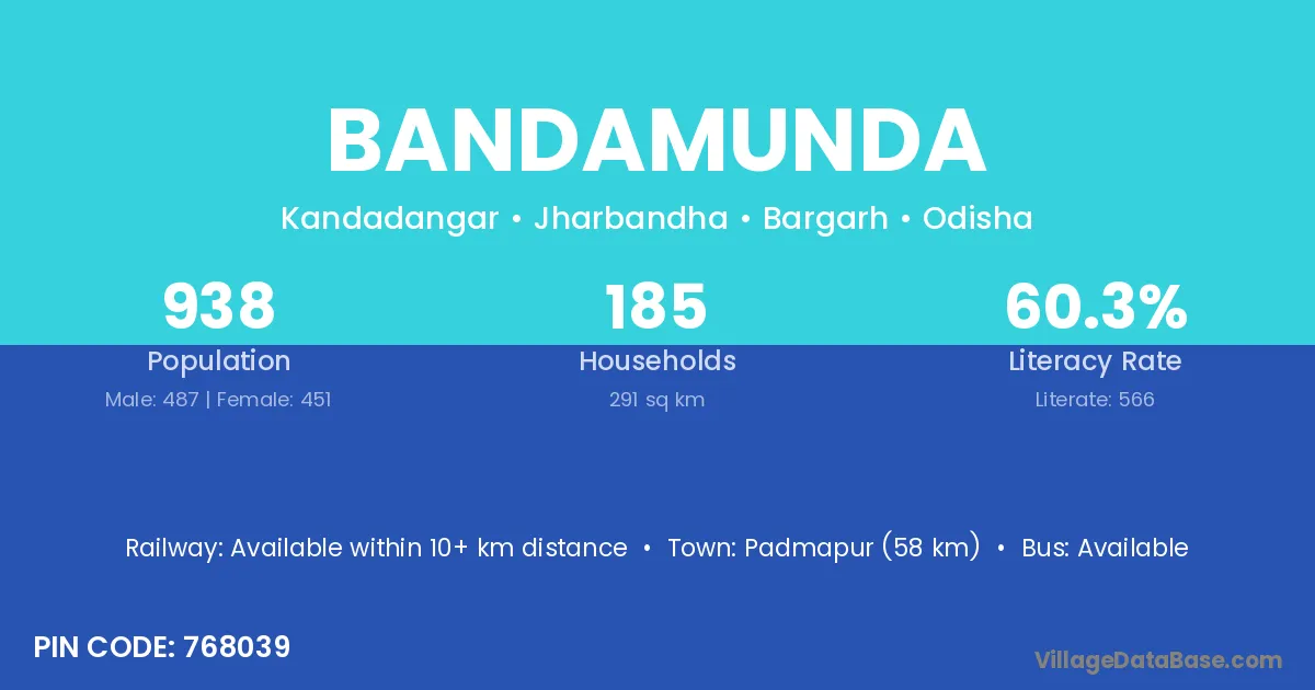 Padmapur (58 km) is the nearest town to Bandamunda village for major economic activities and is located approximately 58 km away.