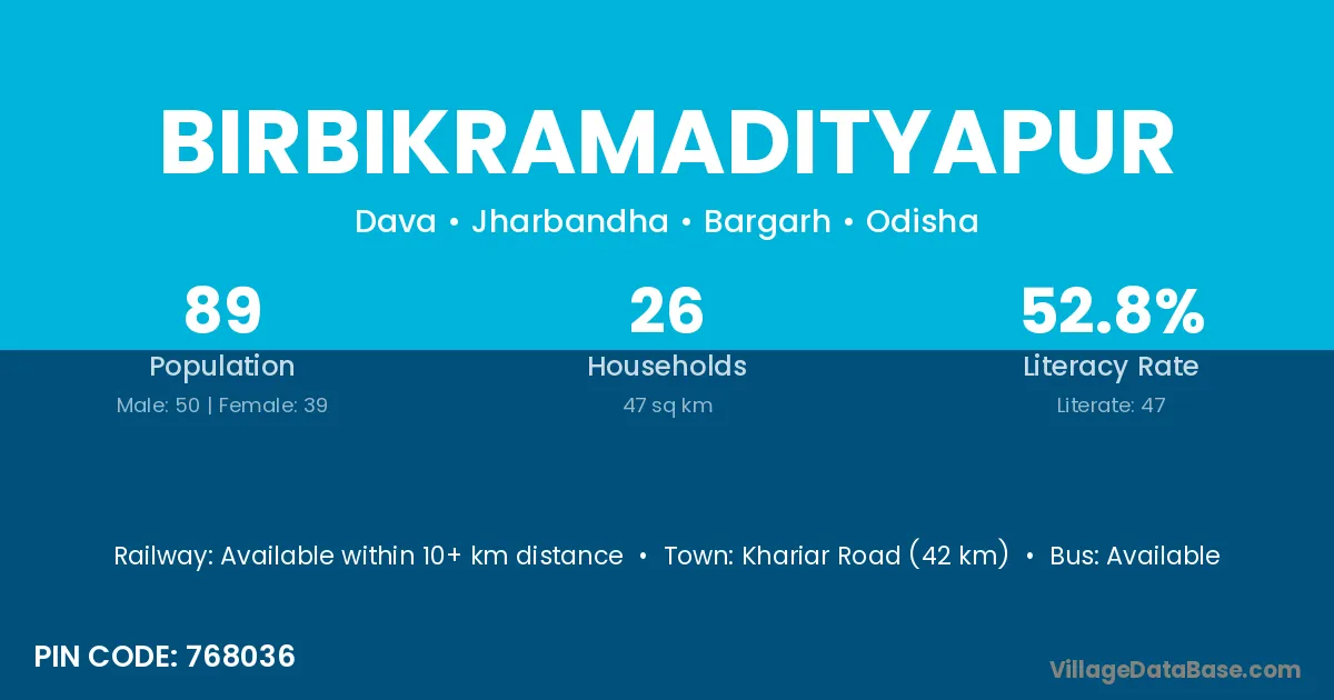 Khariar Road (42 km) is the nearest town to Birbikramadityapur village for major economic activities and is located approximately 42 km away.