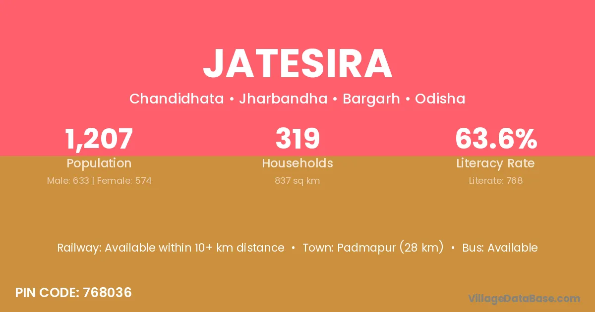 Jatesira village has a total population of 1,207 people, of which 633 are males and 574 are females.