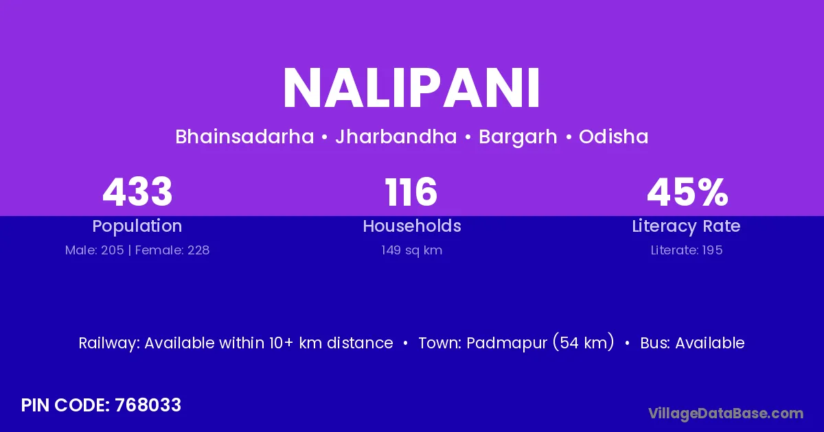 Nalipani village has a total population of 433 people, of which 205 are males and 228 are females.
