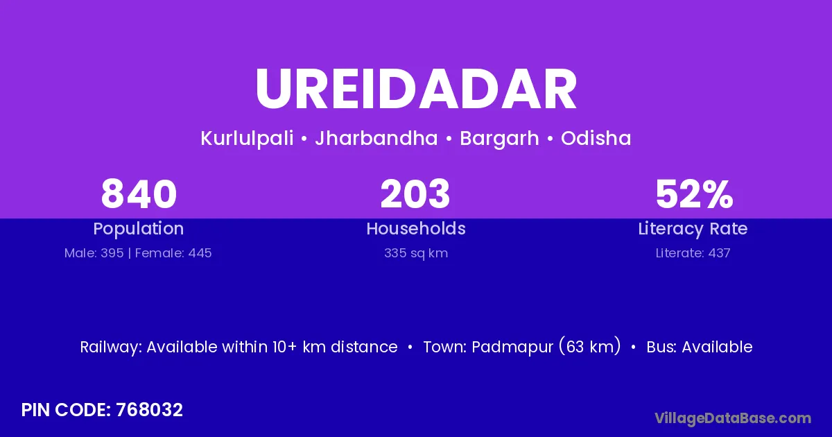 Padmapur (63 km) is the nearest town to Ureidadar village for major economic activities and is located approximately 63 km away.