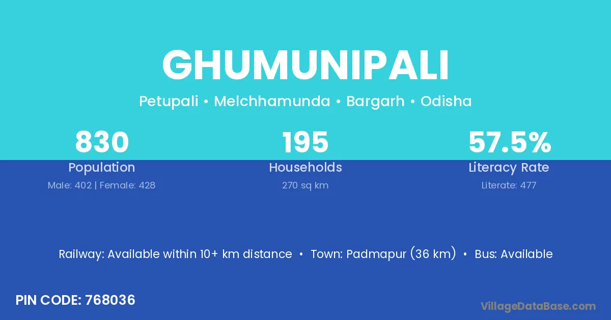 Padmapur (36 km) is the nearest town to Ghumunipali village for major economic activities and is located approximately 36 km away.