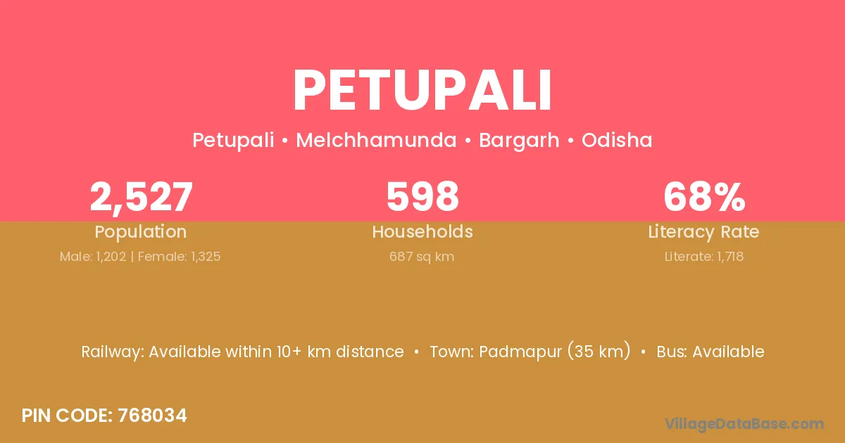Padmapur (35 km) is the nearest town to Petupali village for major economic activities and is located approximately 35 km away.