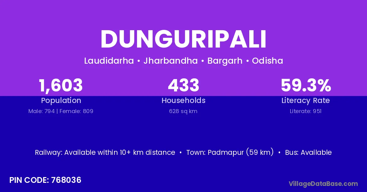 According to Census 2011 information, the village code of Dunguripali village is 768036.