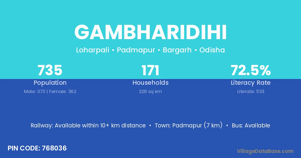 Gambharidihi village has a total population of 735 people, of which 373 are males and 362 are females.