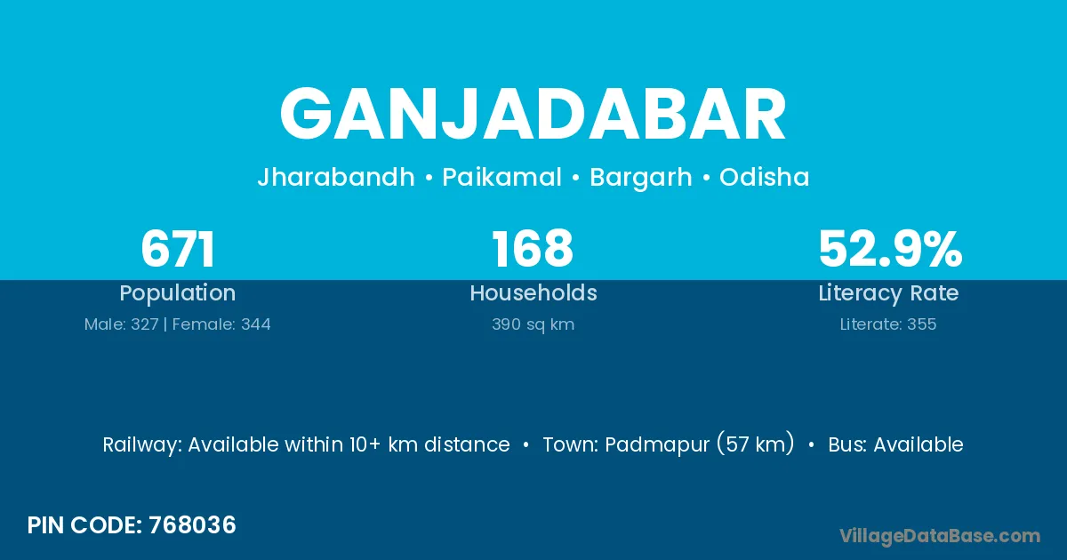 Padmapur (57 km) is the nearest town to Ganjadabar village for major economic activities and is located approximately 57 km away.