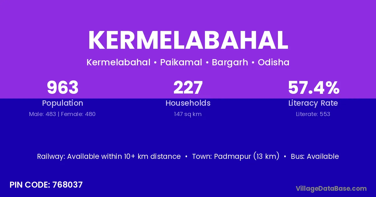 Padmapur (13 km) is the nearest town to Kermelabahal village for major economic activities and is located approximately 13 km away.