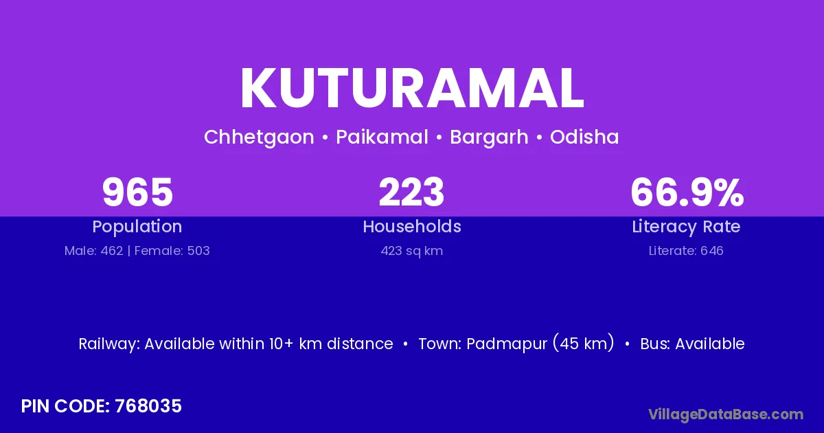 Padmapur (45 km) is the nearest town to Kuturamal village for major economic activities and is located approximately 45 km away.