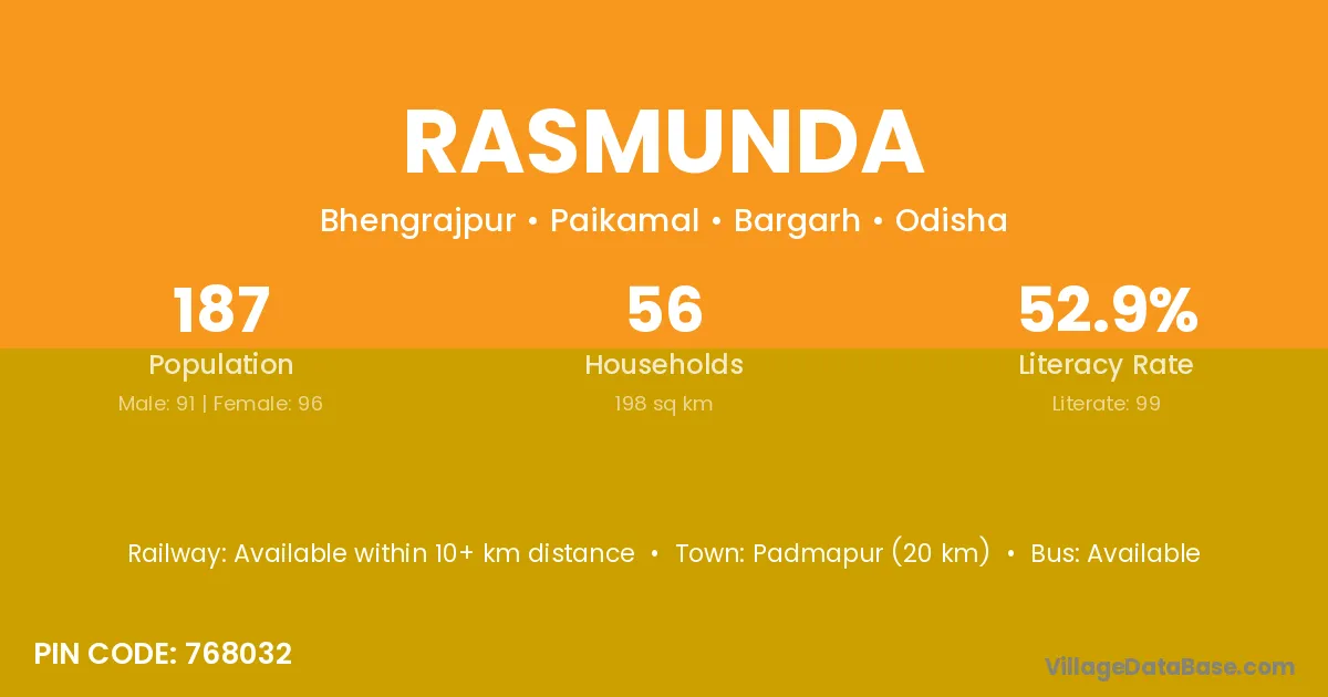Padmapur (20 km) is the nearest town to Rasmunda village for major economic activities and is located approximately 20 km away.